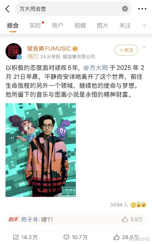 方大同的离世,不仅让音乐界失去了一位杰出的音乐人,也让整个社会失去了一位充满智慧和正能量的榜样。他的音乐、他的遗言、他的一生,都将永远铭刻在人们的心中。愿这位音乐才子在天堂安息,愿他的精神永远照耀着我们前行的道路。